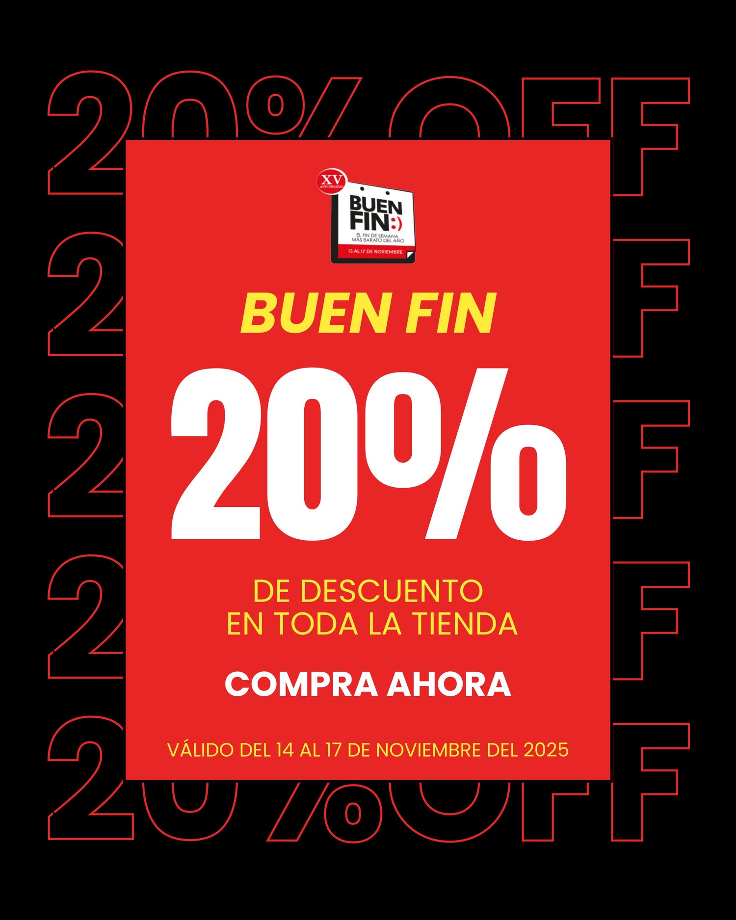 Usa el código de descuento BUENFIN20 al hacer check out y recibe un 20% de descuento en tu compra