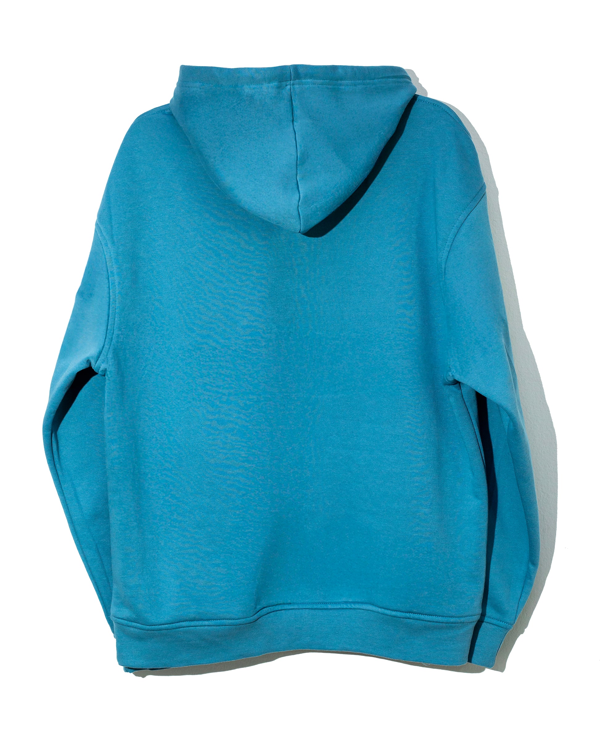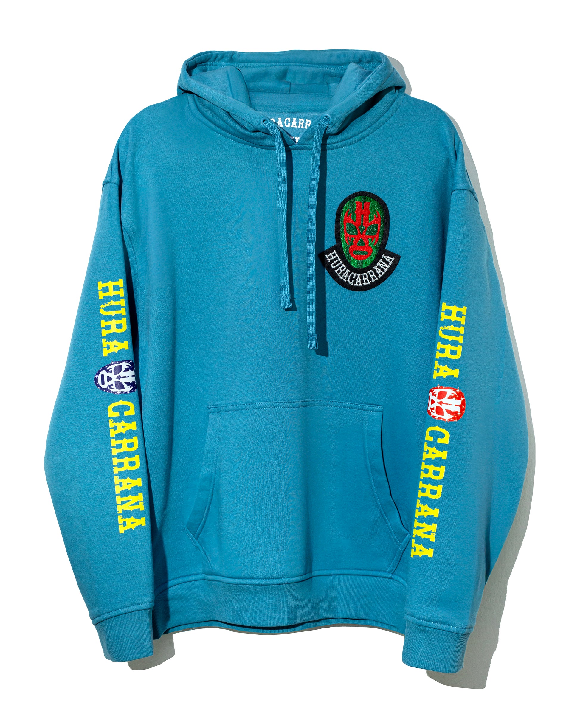 Sudadera celeste con la palabra huracarrana en las mangas y parche bordado al frente