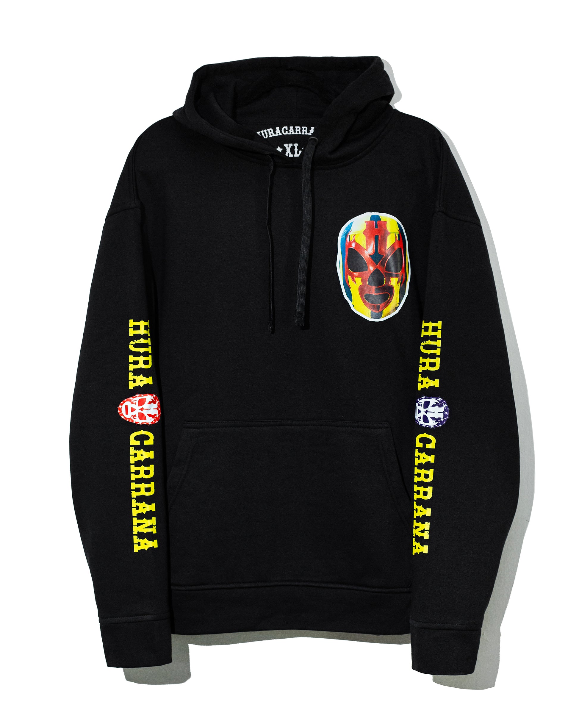 Sudadera negra con la palabra huracarrana en las mangas y mascara al frente