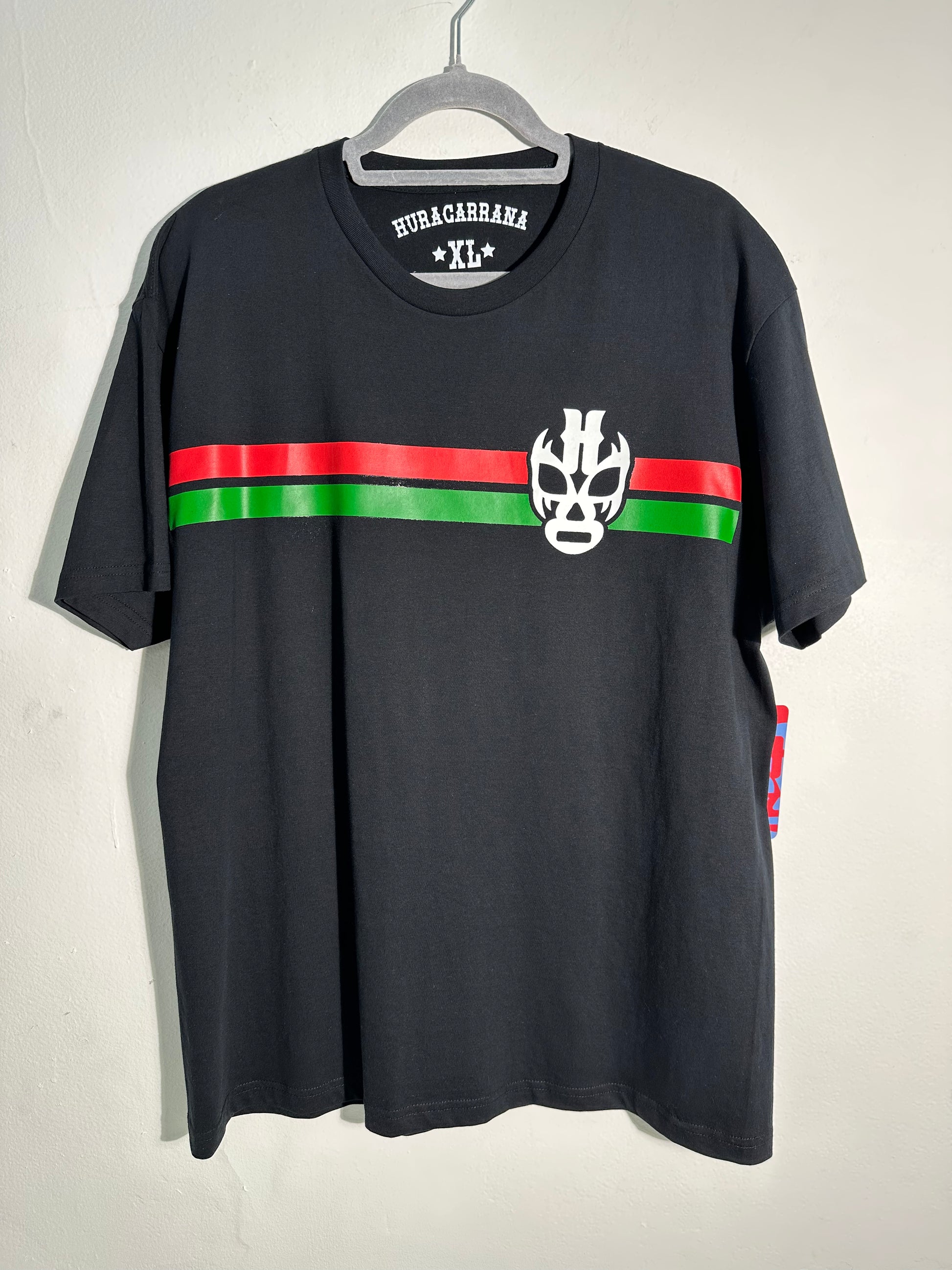 Camiseta de algodón negra con la máscara de huracarrana tipo escudo al frente y en la parte de atrás